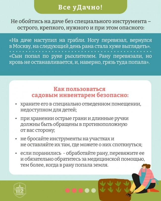 Чтобы дачные выходные оставили только теплые воспоминания и богатый урожай, соблюдайте правила безопасности, не пренебрегайте превентивными мерами и будьте бдительны.