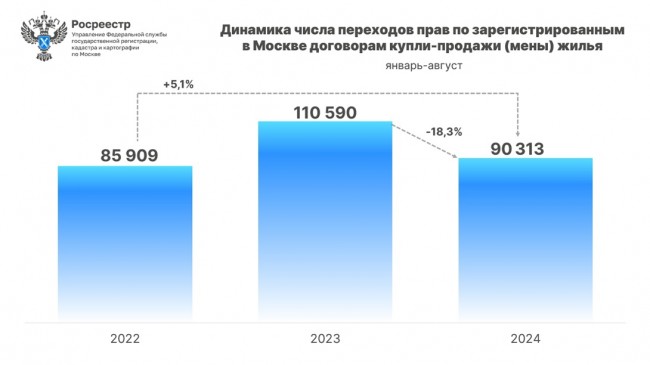 Всего в январе-августе 2024 года в Москве зарегистрировано 90 313 переходов прав по договорам купли-продажи (мены) жилья. Данный показатель на 18,3% меньше рекордных 8 месяцев прошлого года (110 590). К 2022 году (85 909) рост составил 5,1%.