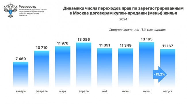 В августе 2024 года Управлением Росреестра по Москве зарегистрировано 11 167 переходов прав на основании договоров купли-продажи (мены) жилья. Показатель снизился на 15,2% к прошлому месяцу (13 165). Об этом сообщил Игорь Майданов, руководитель Управления Росреестра по Москве.