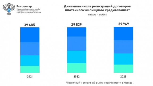 Всего в январе-апреле 2023 года Росреестром по Москве зарегистрировано 39 949 договоров ипотечного жилищного кредитования, что превышает показатели 2022 и 2021 годов (39 529 и 39 485) на 1,1% и 1,2% соответственно.