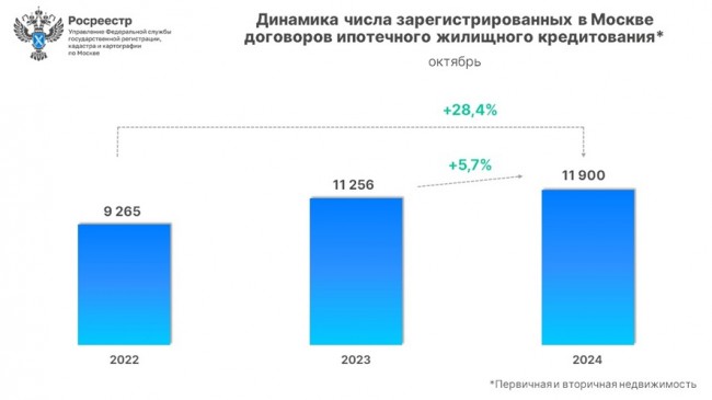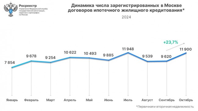 В октябре 2024 года Управлением Росреестра по Москве зарегистрировано 11 900 договоров ипотечного жилищного кредитования на первичном и вторичном рынках недвижимости, что превышает результат сентября текущего года (9 620) на 23,7%.