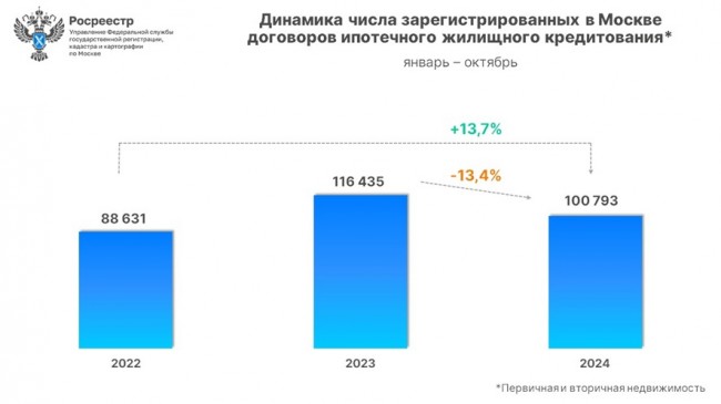 Всего в январе-октябре 2024 года в Москве зарегистрировано 100 793 договора ипотечного жилищного кредитования. Данный показатель снизился к десяти месяцам 2023 года (116 435) на 13,4%, но превзошел результат аналогичного периода 2022 года (88 631) на 13,7%.