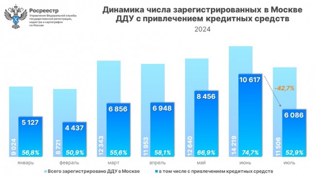 В июле текущего года в Москве зарегистрировано 6 086 ДДУ с привлечением кредитных средств, что практически соответствует среднему ежемесячному числу таких сделок с начала этого года (6,9 тыс.).