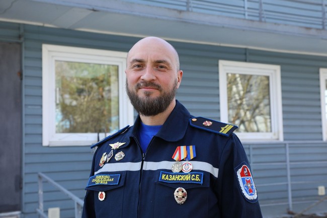 44–летний спасатель Московской городской поисково–спасательной службы на водных объектах Сергей Казанский приходит на помощь людям уже больше 14 лет и имеет звание «Заслуженный спасатель Московской области». Еще он почетный донор и многодетный отец. Как говорит сам герой: «К занятию спортом все эти факторы просто призывают!»